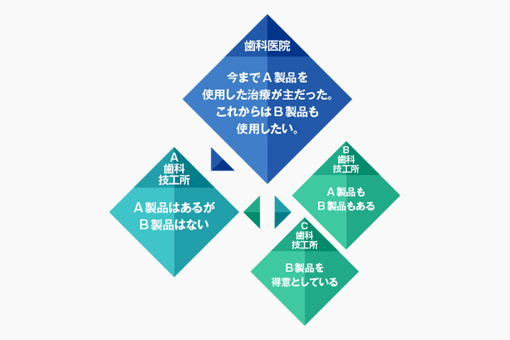 歯科医院様からの要望は技術精度だけでなく、多品種製品の提案や対応にスピード感が必要です。歯科技工技術の評価によるだけでは、顧客開拓と売上アップの実現が難しい時代になってまいりました。御社のニーズ、製品技術などに合わせ営業活動をします。